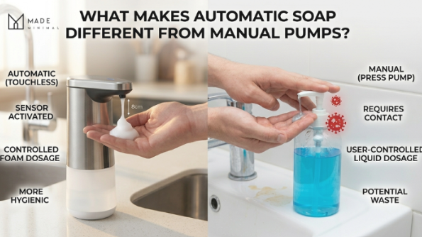 In our experience with hundreds of bathroom accessories sold across Brisbane, the main difference people notice is how the soap gets applied. Manual pumps work with thicker soaps, but need that physical press-down action every time.